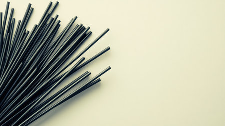 A collection of black straws elegantly scattered across a soft light background. This versatile image captures a stylish and minimalist aesthetic, perfect for promotions or illustrations related to dining and beverage themes.