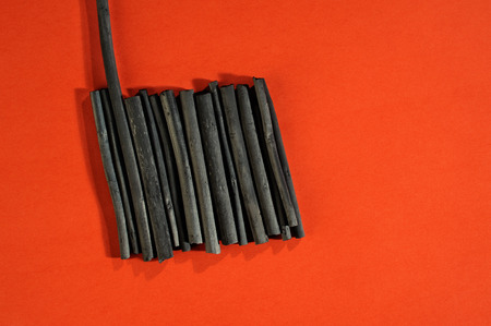 A collection of black straws scattered on a bright orange background, creating a striking visual contrast perfect for design projects and creative needs.