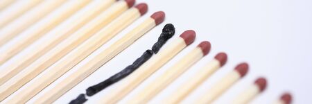Row of burnt matches in white surface with one black match in the middle symbolizing contrast and opposition