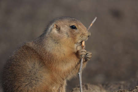 A captivating close-up of a prairie dog intensely focused on a stick in its paws. This wildlife image showcases the beauty and detail of this charming creature in its natural habitat.