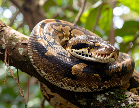 A large boa constrictor coils around a mossy tree branch in a lush forest environment Ideal for wildlife and reptile themed projects.