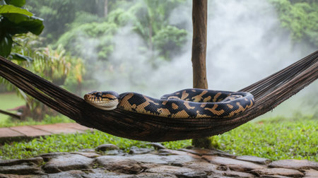 A striking scene featuring a snake lounging on a hammock amidst a lush jungle setting. Soft mist swirls around greenery, enhancing the tranquil atmosphere.