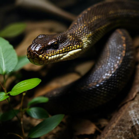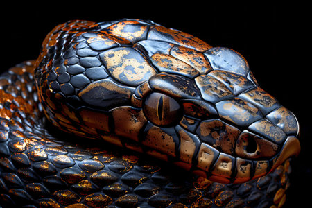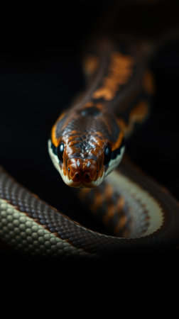 Captivating close-up of a snake displaying vibrant scales and intricate patterns in a dark setting