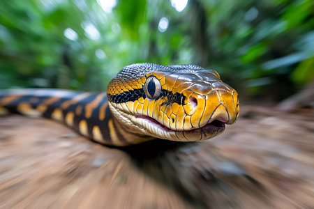 Captivating close-up of a striking snake with an open mouth revealing sharp fangs