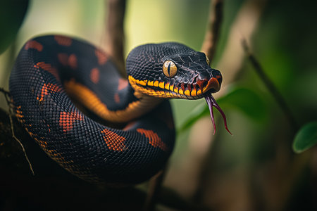 A majestic black and gold snake coils gracefully among the leaves in the vibrant forest.