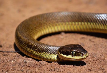 Close-Up Portrait of Coiled Snake, Scales Glistening Under Warm Light, Reptile Photography