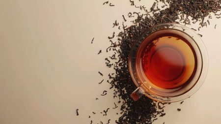 Freshly brewed tea with scattered tea leaves, providing ample space for copy.