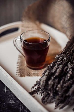 cup, tea, tray, lavender, dried flowers