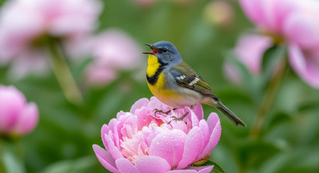 Northern Parula bird perched on a pink peony flower