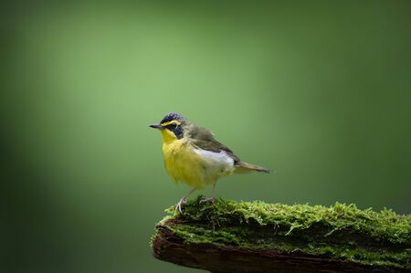 A striking Kentucky Warbler perched on a mossy log with a smooth green background.