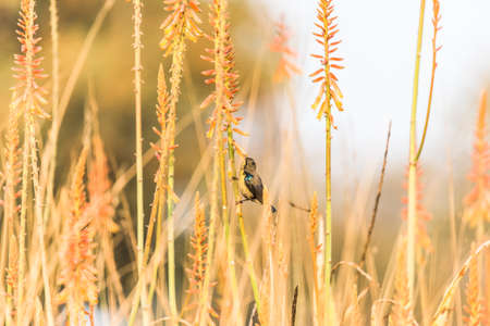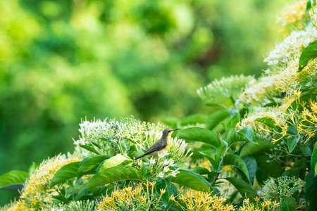 small bird on the tree. Flowers of fragrant and sweet flowers in pollen.