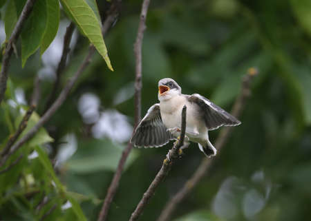 Four lesser gray shrike (Lanius minor) chicks were photographed with a full shot on a tree branch while being fed by their parents. Fun and unusual situations