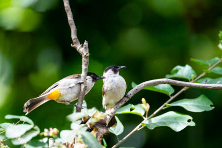 A couple of sooty - headed bulbul is perching together on a tree branches.