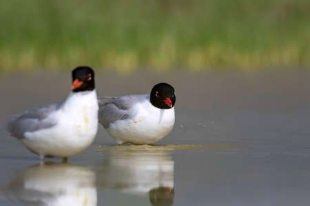 Group of Mediterranean gulls floating on the water (Larus melanocephalus)