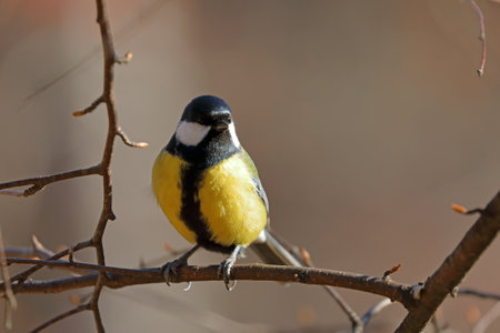 Cute bird Great tit, songbird sitting on a branch without leaves in the autumn or winter. Parus major