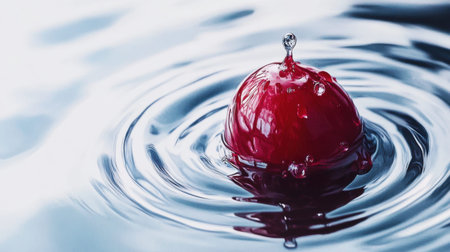 A striking close-up image capturing the moment a vibrant red drop creates ripples and bubbles in clear water, showcasing the elegance and motion of fluid dynamics.