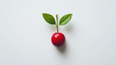 A single fresh red berry with green leaves rests on a white background, showcasing a striking contrast that highlights its natural beauty and freshness, perfect for various design uses.