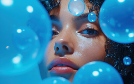A woman's hair is surrounded by a bunch of colorful bubbles. The bubbles are of different sizes and colors, creating a vibrant and playful atmosphere. Concept of fun and whimsy
