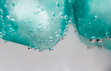 Close up macro Aloe vera gel serum cosmetic texture blue background with bubbles. Cruelty free. Lemongrass gel skincare product. antibacterial liquid with aloe vera, moisturizing.