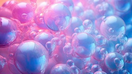 Bubbles float gracefully against a soft pastel backdrop, reflecting light in a captivating display of color and texture.