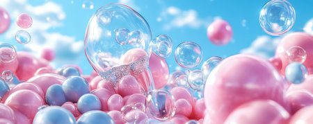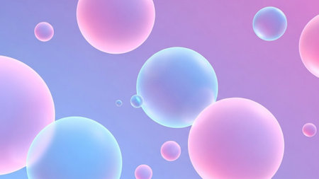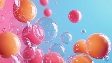 Abstract composition of translucent pink and orange bubbles floating against a pastel blue and pink gradient background, creating a whimsical and modern aesthetic.