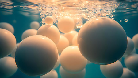 Bubbles rise and float in clear water, creating a simple scene with soft lighting. The clear background adds depth to the view of the bubbles in motion.