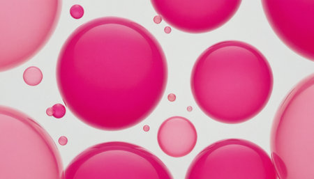 A collection of various sized pink spheres and smaller bubbles are scattered across a bright, white background. The spheres exhibit a gloss and smooth texture, with some appearing more opaque and vibrant pink while others are lighter and more translucent. The lighting is bright and even, creating distinct reflections on the surfaces of the spheres. This abstract composition evokes a sense of lightness and fluidity, beauty or cosmetic themes.