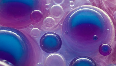 This macro a dense arrangement of various-sized, iridescent spheres in shades of purple and blue, nestled within a swirling, pinkish fluid. The spheres are highly reflective, capturing the light and the surrounding colors, creating a sense of depth and dimension. The fluid medium appears to a smooth, almost creamy texture with subtle swirling patterns. The overall impression is one of a vibrant, abstract composition with organic and scientific undertones.