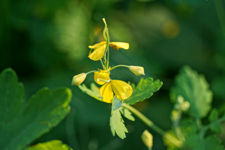 one small wild yellow flower of celandine on a green stalk with leaves in nature