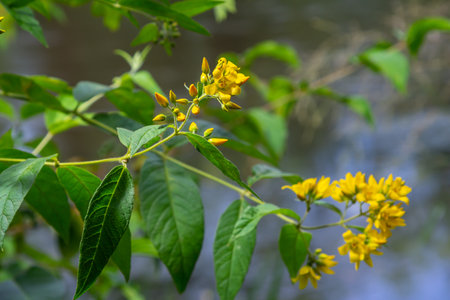 Lysimachia vulgaris flower, the garden loosestrife, yellow loosestrife, or garden yellow loosestrife, blooming in summer. Beautiful yellow floral background.