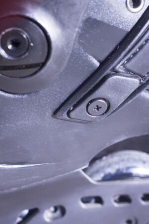 Close up wheel and chain of mountain biking. Landscape view of disc break system and front Derailleur of moutain bike. bicycle parts titanium color and frame aluminium. Shift lever and brake lever.