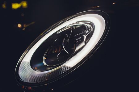 Close up of headlight detail of modern luxury car with projector lens for low and high beam. Front view of sport crossover vehicle head lamp. Concept of car detailing and light technology background.