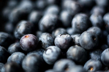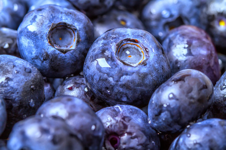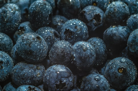 Blueberries covered by water drops. Macro photography of fresh blueberries. Ripe blueberries background. Blueberries texture. Food photography collection.