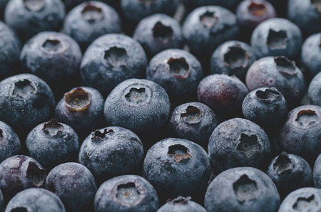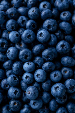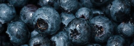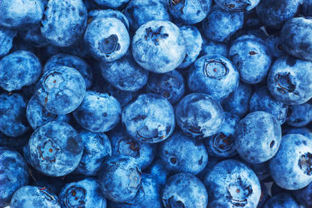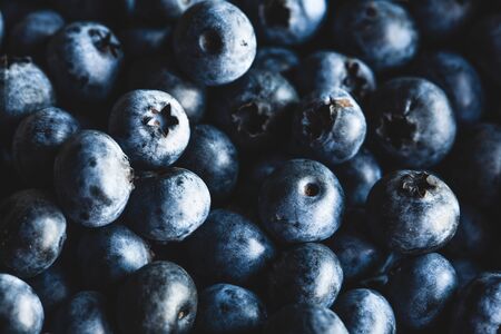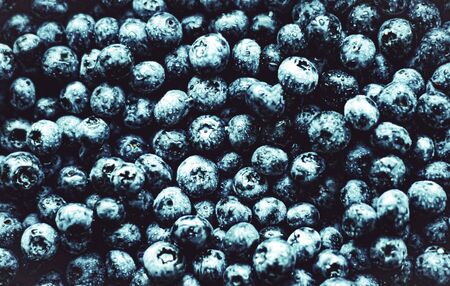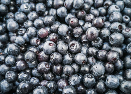 Blueberry background. Ripe, wet and juicy fresh picked blueberries, closeup. Organic Blueberries, macro shot. Vegan sweet food, market.