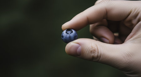 Hand holding a single fresh ripe blueberry, showcasing its vibrant blue color and natural texture. emphasizes healthy eating and organic produce.