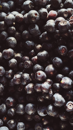 Blueberries background. Blueberries are piled on the table. Berry texture. Many berries close up. Soft focus. AI generated