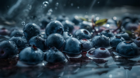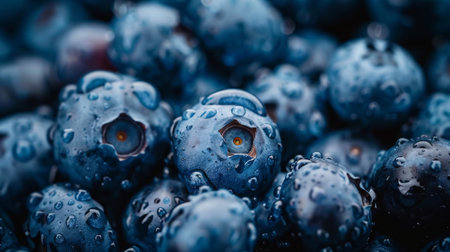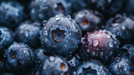 A macro shot of fresh blueberries covered in tiny water droplets, emphasizing their vibrant color, freshness, and natural texture.