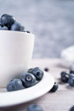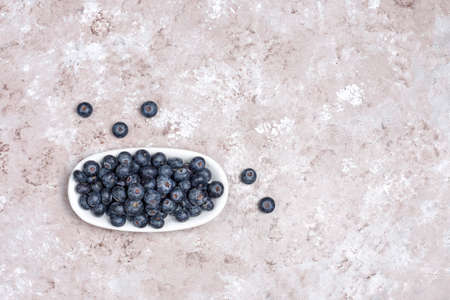 A view from above on delicious and juicy blueberries on a light blue background. Tasteful, raw and ripe blueberries full of vitamins. Organic ingredients for nutritious summer desserts.