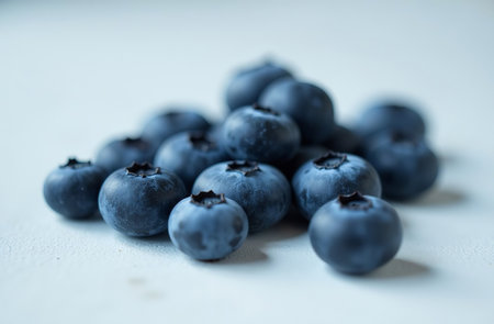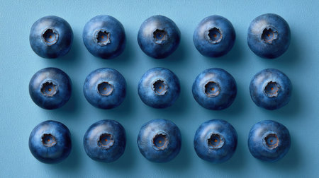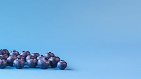 Fresh blueberries scattered on a light blue surface create a vibrant and appealing scene. Ideal for food photography, healthy eating themes, or culinary inspiration.