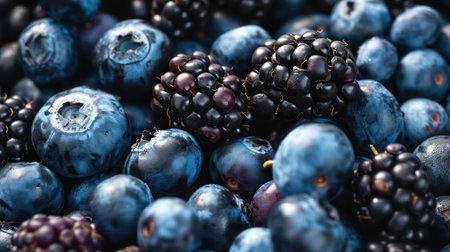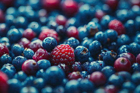 Fresh berries burst with color, creating a vibrant display in a natural setting. The assortment includes a variety of blueberries and raspberries, highlighting their juicy textures. Dewdrops glisten on the fruit, adding to the beauty of this organic food concept, inviting a sense of freshness and vitality.