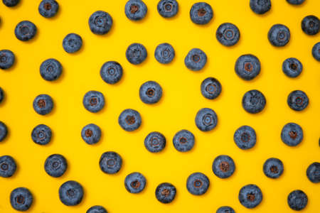 Colorful fruit pattern of blueberries on yellow background. Top view. Flat lay