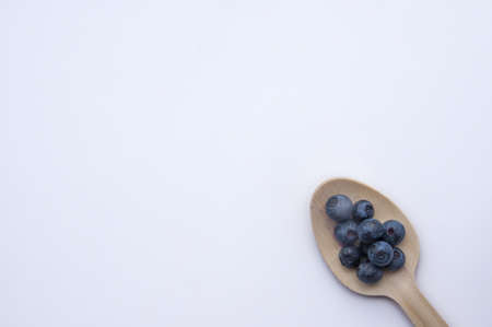 Flat lay of recycled spoon and juicy, fresh blueberries on color table. Space for text. Isolated ripe sweet bilberry fruits in eco spoon on white background. Copy Space. Healthy raw vegetarian food