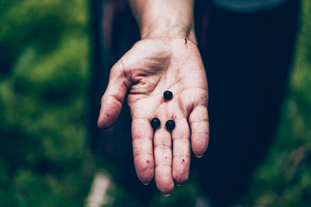 Gardener holding fresh black wild berries picked in the forest in his hand
