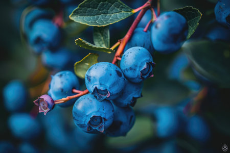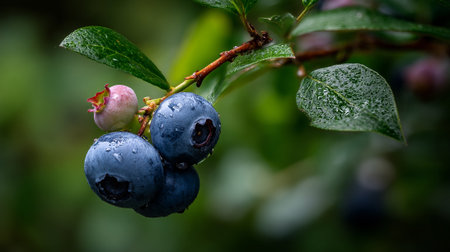 Ripe blueberries glistening with raindrops on a lush branch in nature.
