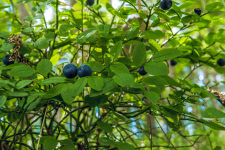 Fresh organic wild ripe blueberries on the bush with green leaves in the woods in summer, close up