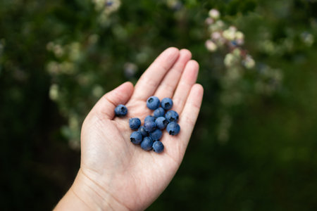 Female hand picked blueberries at backyard. Fresh and ripe organic blueberries grow in a garden on a summer day. Blueberry crop before harvest. High quality