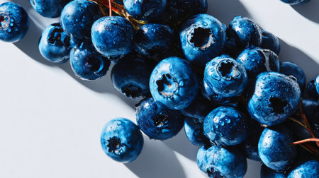 A close-up view of fresh blueberries with glistening water droplets on a pristine white surface. Perfect for showcasing healthy eating, vibrant colors, and culinary inspiration.