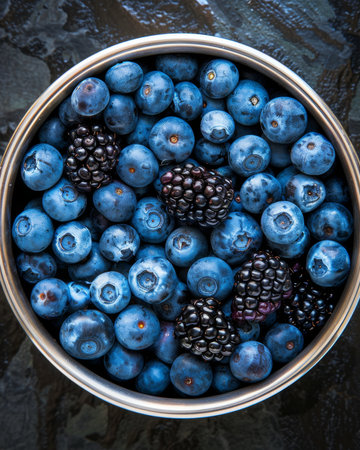 Vibrant bowl of fresh blueberries, blackcurrants, and blackberries for a healthy snack