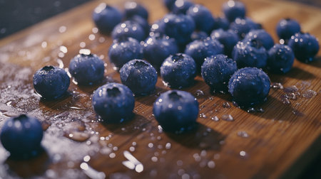 A flat-lay of freshly washed blueberries scattered across a wooden cutting board, droplets of water glistening on the smooth skin of each berry.