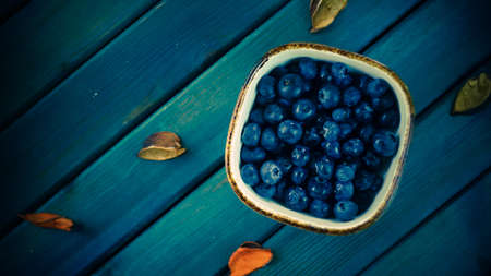 Some blueberries in a decorate small bucket on wooden banch in the garden on summer sunset, close up shot, healthy food concept